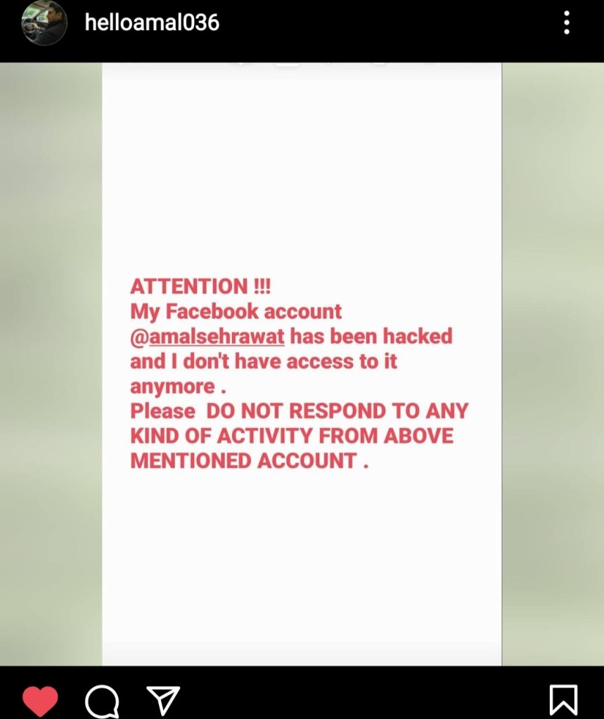 Amal Sehrawat, knows for his role from Choti sarrdaarni, experimented a frustrating experience. The actor realized that his Facebook account was hacked by some people. He announced his fans though a post on Instagram about the news and advertising them to do not reply to any messages from his Facebook account. Because of this, the actor made a special message like a post and told to his fans.